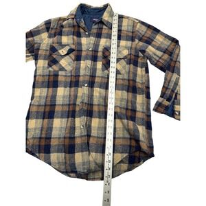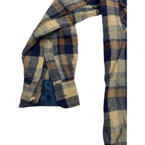 A classic men's plaid button-up shirt, this garment boasts a comfortable wool blend and a cozy quilted lining for added warmth. The timeless plaid pattern, featuring rich tones of navy, brown, and beige, makes it a versatile addition to any wardrobe.