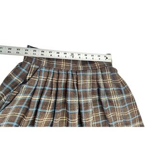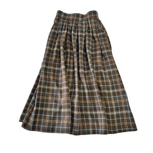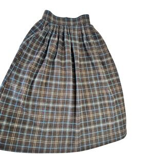A charming plaid full skirt. This skirt features a classic plaid pattern in rich brown, accented with hints of blue and beige, creating a timeless appeal. The pleated design at the waist adds volume and movement. Side pockets. Zip Back. No material or size tags but it feels like wool and should fit like a modern size small based on the measurements.