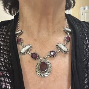 This vintage-inspired necklace showcases a beautiful blend of sterling silver, with natural deep pigeon blood red natural Ruby. Also has natural pearl stones,handcrafted artisan.Stunning