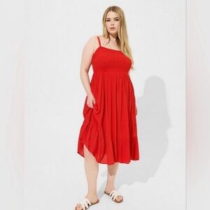 Torrid Red Midi Washable Gauze Smocked Bodice Tiered Dress size 2 (Fits 18-20)