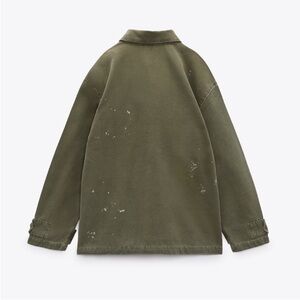 Cool olive green jacket with big pockets and bleach splatter design. Fits like an oversized medium or a regular large.