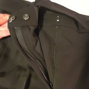 NWT black wide-leg trousers by H & M. Versatile and stylish. The front has pockets, while the back pockets are faux. Beautifully pleated with elastic in waistband, along with silver clasp/zipper front closure. There is also a traditional hidden side buttn for an extra secure closure. Adjustable black belt with silver looping. Ideal for any wardrobe; perfect for the office! See pics for approximate measurements