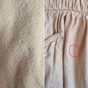 Three small pin holes near right pocket. (See photos) The area falls within a pleat and they are very small. Otherwise, in good used condition with no stains or tears.