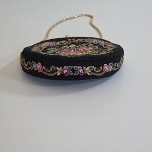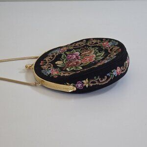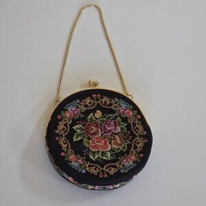 Vintage Floral Petit Point Purse Round Needlepoint Tapestry Evening Bag Clutch