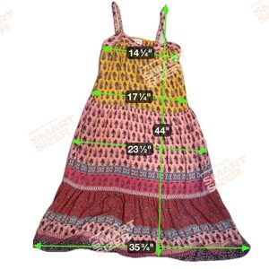 Beautiful Knox Rose boho tiered maxi dress featuring a mixed floral and border print in warm earthy tones. Lightweight rayon fabric with full lining for comfortable wear. Adjustable spaghetti straps and a relaxed, flowy silhouette make this an easy everyday or vacation piece.