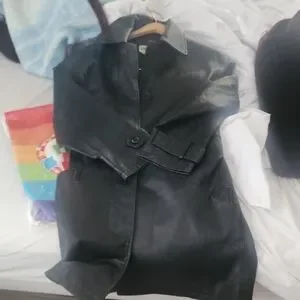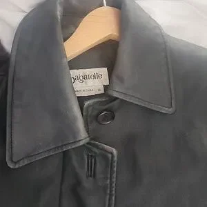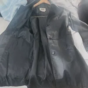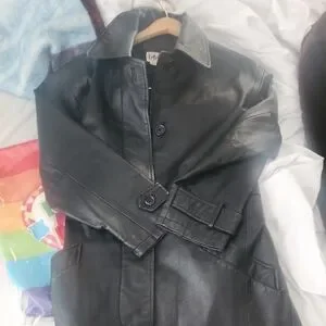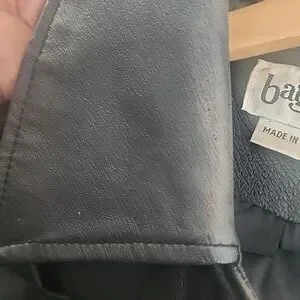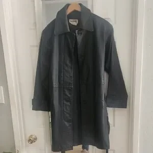 Vintage black genuine leather trench coat by Bagatelle with a structured, edgy silhouette. Features a classic collar, button front, adjustable waist tie, and midi length for a timeless yet bold look. Perfect for fall layering, street style, or minimalist wardrobes.