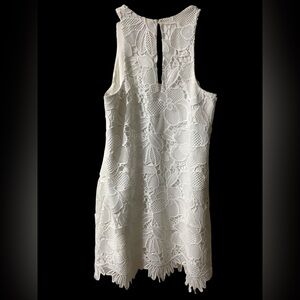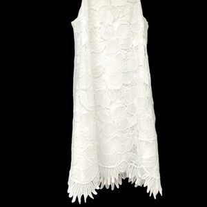 A white lace wonder. Sleeveless shift dress in polyester jumbo floral lace.