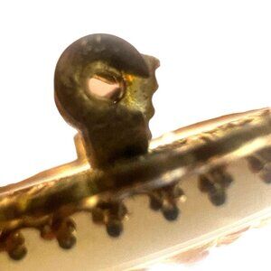 Set in an ornate gold-tone filigree frame, this piece reflects the high-quality Bohemian jewelry craftsmanship that Czechoslovakia was renowned for in the early 20th century. Czech glass cameos from this era were widely exported and are now highly collectible.