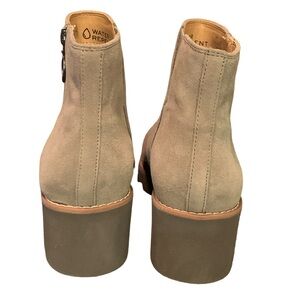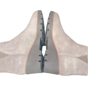 Chic beige suede boots with side zipper. Comfortable wedge sole. Perfect for everyday style.