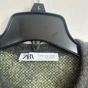 Chic Zara cardigan with argyle pattern. Features green and brown tones. Perfect for layering.