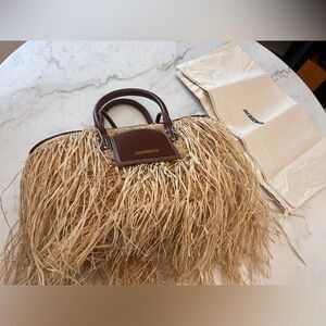 Beautiful Jacquemus Le Panier Soli fringe raffia tote bag with brown leather trim. 100% raffia, trim: bovine leather