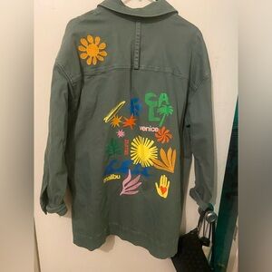 Stylish green jacket featuring vibrant graphic designs. Perfect for adding a pop of color to your wardrobe.