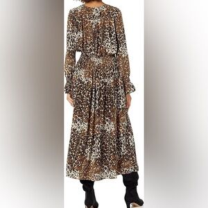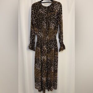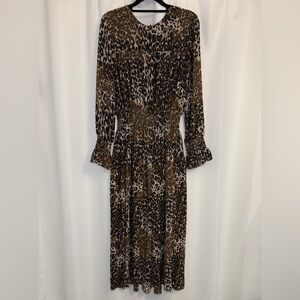 Stylish animal print dress. Features long sleeves and a figure flattering hourglass silhouette.