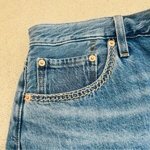 Classic Levi's jean shorts in light blue. Features a frayed hem and timeless design. Ideal for casual wear.