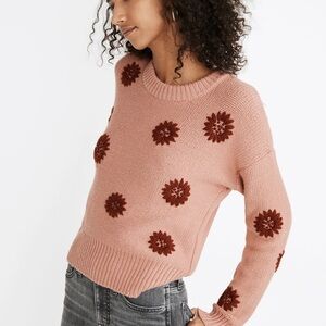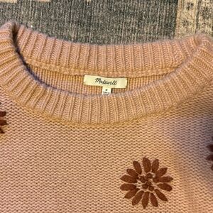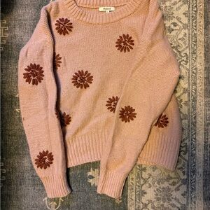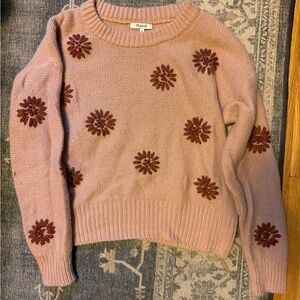 Chic pink sweater with floral accents. Crew neck design. Perfect for casual wear.
