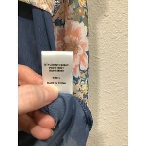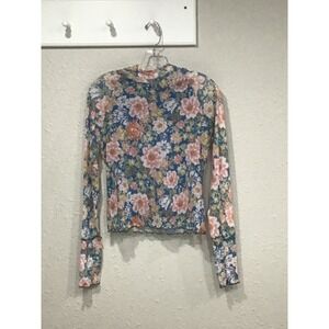 Magnolia Boutique Blue Floral Sheer Mesh Top Mock Neck L Boho Indie Y2K Coquette