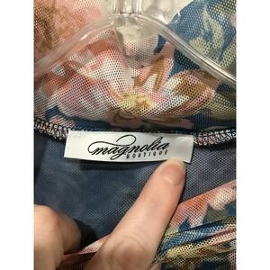 Elevate your layering game with this Magnolia Boutique blue floral mesh top in size Large. Designed in a lightweight sheer stretch mesh, this long sleeve top features an allover romantic floral print with a flattering semi-fitted silhouette. Perfect worn alone with a bralette or layered under dresses, tanks, or jackets.