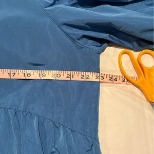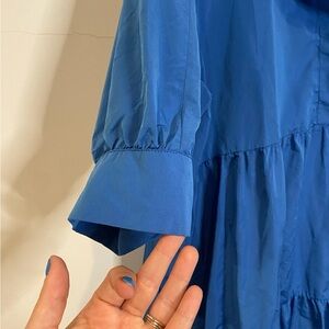 Chic blue midi dress with puff sleeves. Features a tiered design for a stylish look.