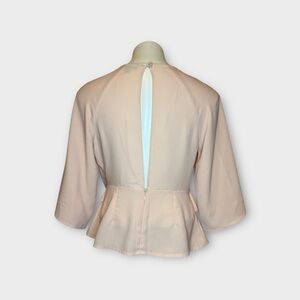 Back zipper and button back closure, 3/4 sleeves, peplum pink top. 100% polyester. Care tag was cut off. No measurements available due to the uniqueness fit. First 3 photos are stock.