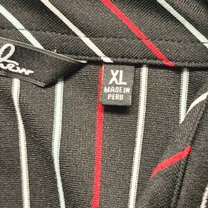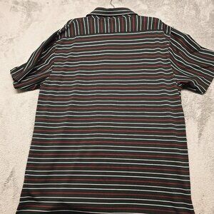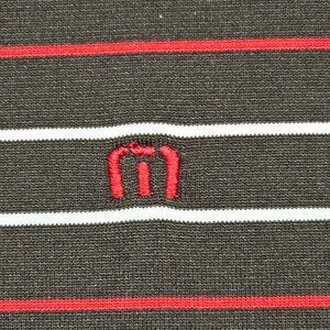 The Travis Mathew Polo Shirt in Men's XL features a stylish black striped design, perfect for a casual or travel occasion. Made from polyester material, this short sleeve polo shirt with a collared neckline and button closure is ideal for warm weather in the summer and spring seasons. The shirt is machine washable for easy care and showcases the Travis Mathew logo as an accent. Designed with a regular fit, this polo shirt is both comfortable and fashionable for any man looking for a quality sport-inspired garment.