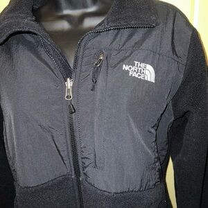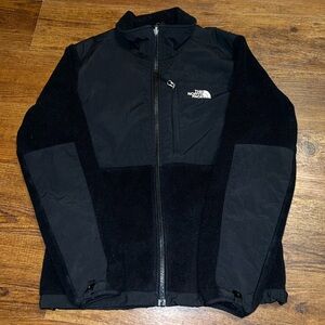 The North Face classic black denali polartec fleece long sleeve zip up jacket with white logo, front side zip pockets and zipper pocket at the chest.