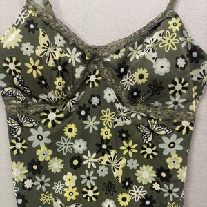 Keywords: cami dress, floral print, butterfly print, lace trim, olive green, mini dress, spaghetti strap, flared hem, y2k fashion, fairycore, sweet, cute, girlie