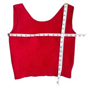Angora rabbit hair sweater tank top in a vibrant red hue. This sleeveless knit top features a flattering scoop neckline and a soft fuzzy texture. The cropped length adds a touch of modern chic to the classic silhouette. It's a versatile layering piece or a standalone statement item, perfect for the holiday season