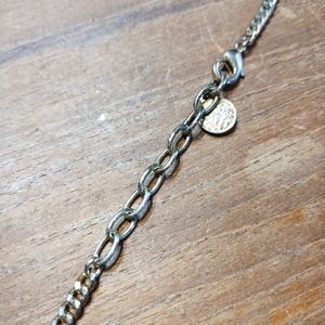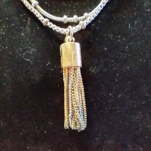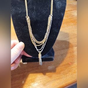 Multi strand gold coloured necklace with chain dangle pendant. Has a brand tag but is undecipherable. Appears to be vintage.
