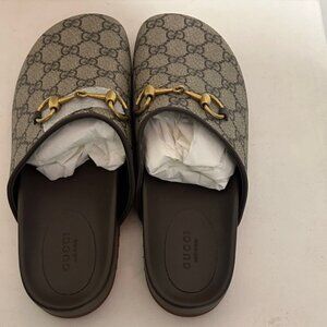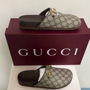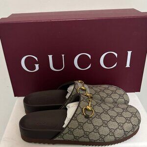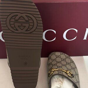 Authentic Elegant Gucci slippers with signature monogram pattern. Features luxurious gold hardware.