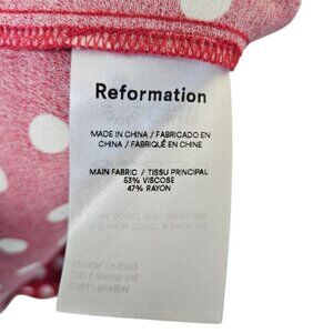 A playful statement piece, this Reformation mini dress bursts with retro charm. The vibrant red backdrop is playfully adorned with crisp white polka dots, creating a visually striking and undeniably fun look. Its sleeveless design and flattering silhouette make it perfect for warm weather adventures, while the mini length adds a touch of youthful energy. The dress features a classic scoop neckline and a concealed back zipper for a seamless fit. Imagine yourself twirling at a summer garden party, enjoying a picnic in the park, or dancing the night away at a casual get-together in this delightful dress.