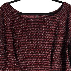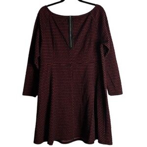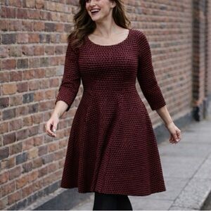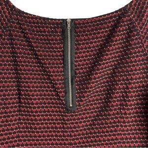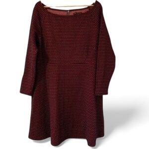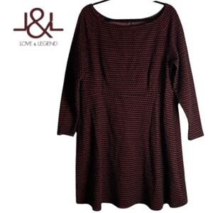 Looking for a flattering fit and flare dress that’s a little bit sexy? This Love & Legend textured boat neck skater with wider neckline might be just the dress. The A-line shape creates a waist with a fuller skirt for twirl. Exposed zipper detail at the back. Long sleeves. Red and black. Not lined. Excellent preloved condition. Smoke free home. Substantial textured knit material with stretch. Please see video 🎥for detail. The approximate measurements laying flat: