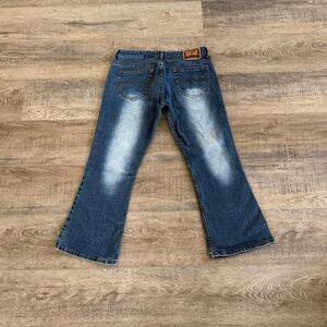YMI lets UBU Y2K bleach dark wash flare capri jeans. Size 9.