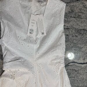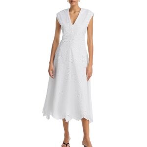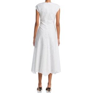Chic white midi dress with eyelet pattern. V-neck and cap sleeves. Perfect for versatile styling.