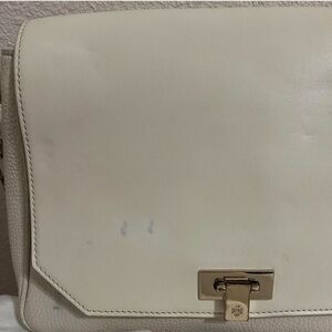Tory Burch off white pebbled leather crossbody bag with gold tone turnlock closure and chain strap. Classic structured flap style that works for everyday or dressed up.