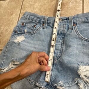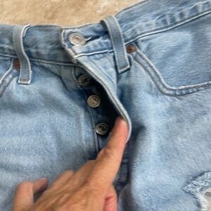 Keywords: Levi's 501 shorts, women's denim shorts, distressed jean shorts, cutoff shorts, frayed hem shorts, light wash denim, button fly shorts, summer shorts, casual shorts, festival fashion, vintage denim, retro shorts, size large shorts