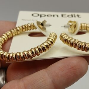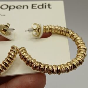 Modern and stylish Open Edit gold-tone hoop earrings featuring a textured, stacked ring design that gives the hoops a bold, dimensional look.