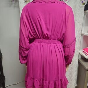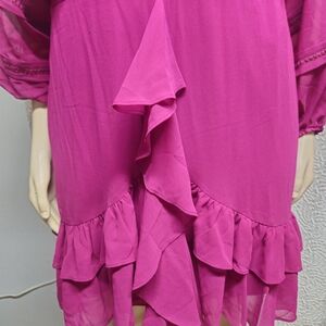 This stunning pink midi dress by City Chic features a flattering wrap design with a plunge neckline, perfect for a cocktail night out. The dress is adorned with intricate embellishments and ruffled tiers, adding a touch of elegance and movement. The 3/4 dolman sleeves complete the look, making it a standout piece for any special occasion.
