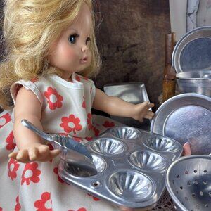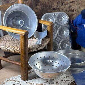 Vintage 1960s Toy Aluminum Bakeware Set | Muffin Tin, Colander & Pans | Mid Cent
