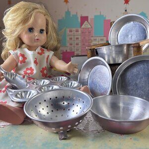 These charming vintage toy aluminum kitchen pieces date to the late 1950s–early 1960s, when children’s play cookware was still made from real spun aluminum rather than plastic.