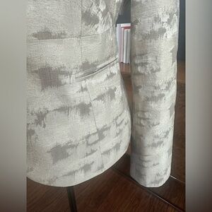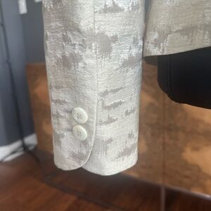 This Armani Collezioni blazer features a luxurious pattern in cream and gray, offering a sophisticated and elegant look. The structured tailoring and classic notched lapel make it ideal for formal events or upscale occasions. This blazer is stunning and is a staple piece to any wardrobe. Size 6