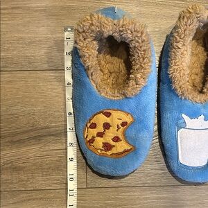 Cozy blue slippers featuring a fun cookie and milk design. Perfect for lounging. Worn 1 time! Super soft!