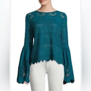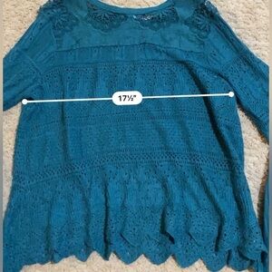 Bell sleeves, scalloped trim, keyhole button back enclosure, crocheted, linen, rayon, nylon, modal blend. EUC, no holes or tears in the pattern. See pics doe approximate measurements