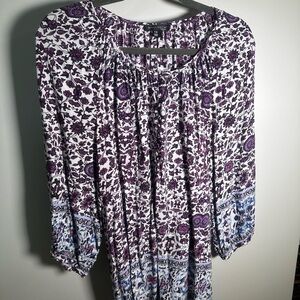Willi Smith purple floral print blouse, size 1X, featuring long sleeves and a relaxed fit.