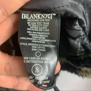 Blank NYC faux Sherpa Teddy Camo green jacket in size small. New with tag, minor pulls or thread snags. Button closures at front with 2 front chest pockets and 2 seam pockets, quilted inner lining. Measurements are approximates only
