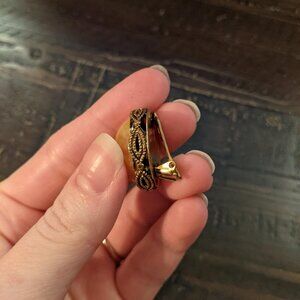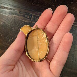 Vintage MCM Butterscotch Resin Brooch Clip-On Earrings Set Gold Tone Ornate Glam