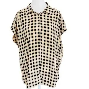 LOFT Outlet button front black & tan check camp style blouse size L. Cap sleeve, rounded bottom hem, 100% polyester.