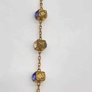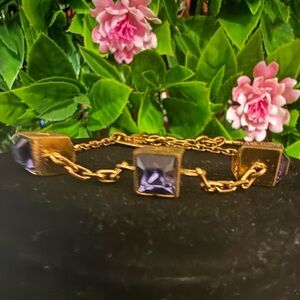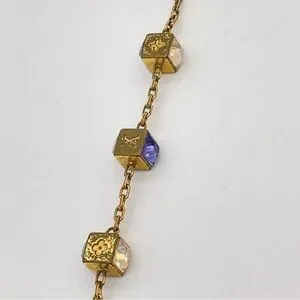Chic gold bracelet with purple cube dice details. Was worn a lot so the metal does have heavy signs of use like scratches dents and color loss. The bracelet is in good working condition. Bracelet is adjustable. Please zoom in and examine photo and ask any questions you have before purchasing. Price reflects condition Thank you