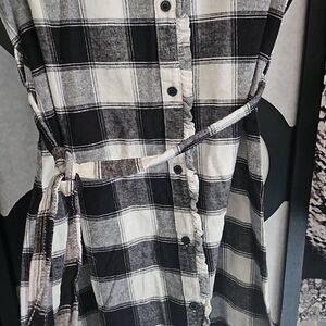 Falls Creek black and white, plaid flannel button-down top. Junior girls size XL. It has a belt and ruffles down the seams where it buttons. Cute Measurements approximate: Length 30 inches and pit to pit buttoned is 17 inches.