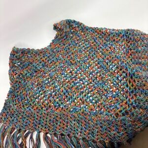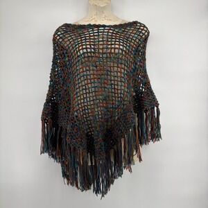 Womens Crochet Poncho Sweater Multi Color Fringe Boho Casual Handmade OSFM
