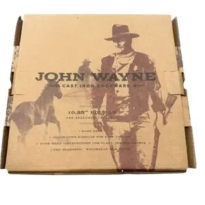John Wayne Cast Iron 10.25 inch pie pan pre seasoned with decorative handles. This durable cast iron pan features even heat distribution for flaky golden crusts and a naturally non-stick surface. Its embossed design with the John Wayne logo adds a touch of Western charm to your kitchen. Perfect for baking pies, quiches, or even savory dishes for family gatherings or a rustic brunch.